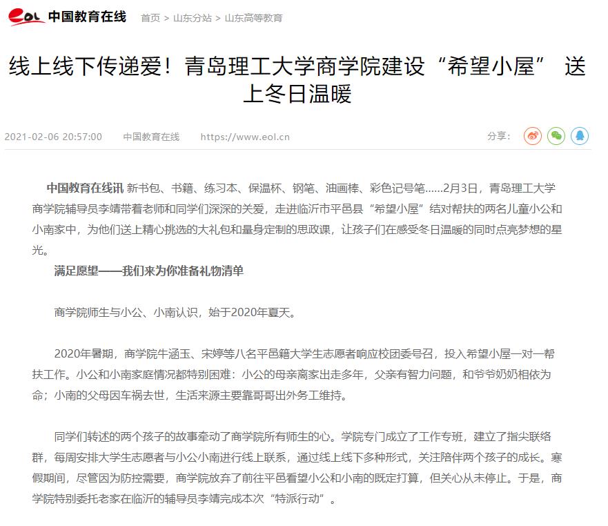 中国教育在线:线上线下传递爱!青岛理工大学商学院建设“希望小屋” 送上冬日温暖