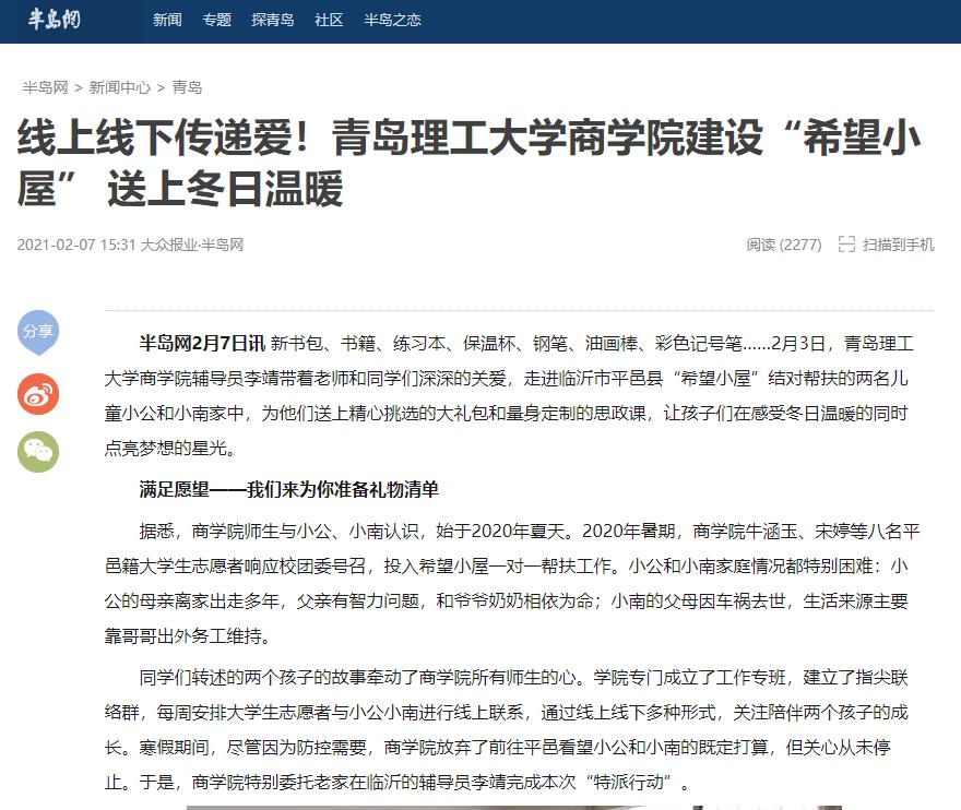 半岛网:线上线下传递爱!青岛理工大学商学院建设“希望小屋” 送上冬日温暖