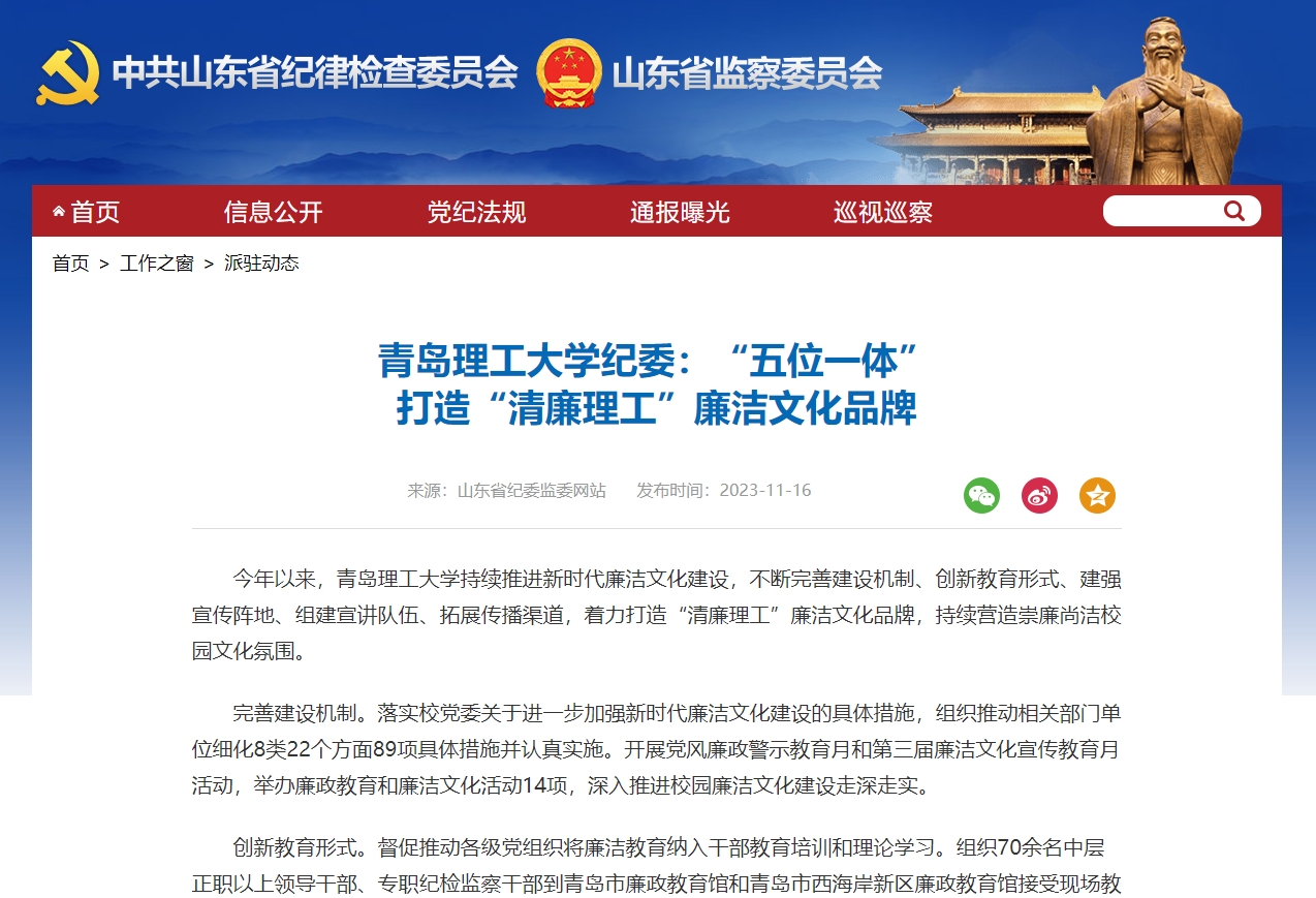 山东省纪委监委网站:青岛理工大学纪委——“五位一体”打造“清廉理工”廉洁文化品牌