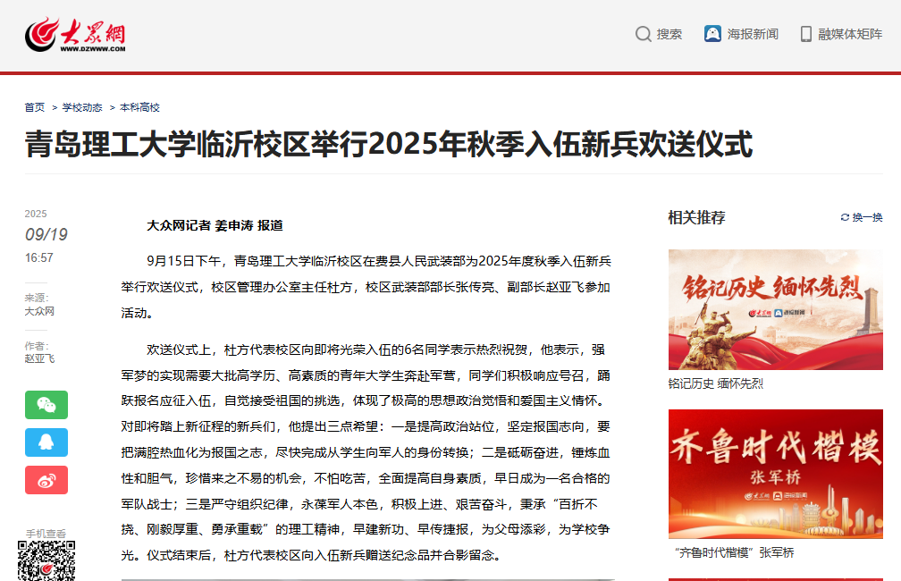 【大众网】青岛理工大学临沂校区举行2025年秋季入伍新兵欢送仪式