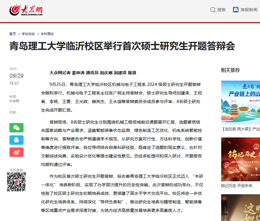 【大众网】青岛理工大学临沂校区举行首次硕士研究生开题答辩会