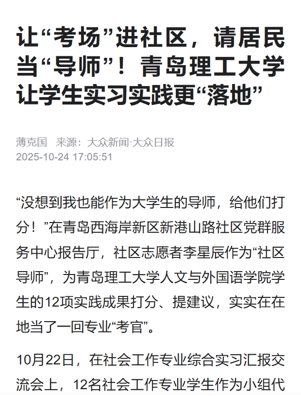 【大众新闻·大众日报】让“考场”进社区,请居民当“导师”!青岛理工大学让学生实习实践更“落地”