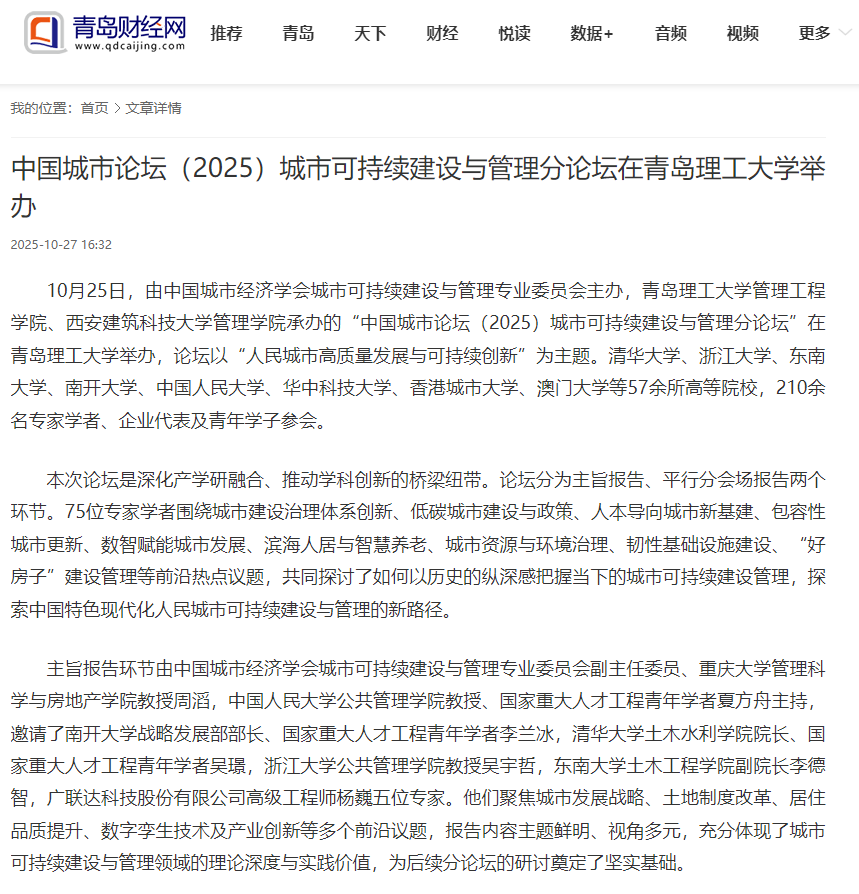 【青岛财经网】中国城市论坛(2025)城市可持续建设与管理分论坛在青岛理工大学举办