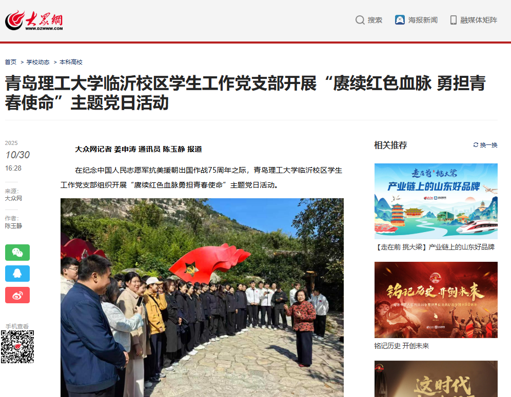 【大众网】青岛理工大学临沂校区学生工作党支部开展“赓续红色血脉 勇担青春使命”主题党日活动