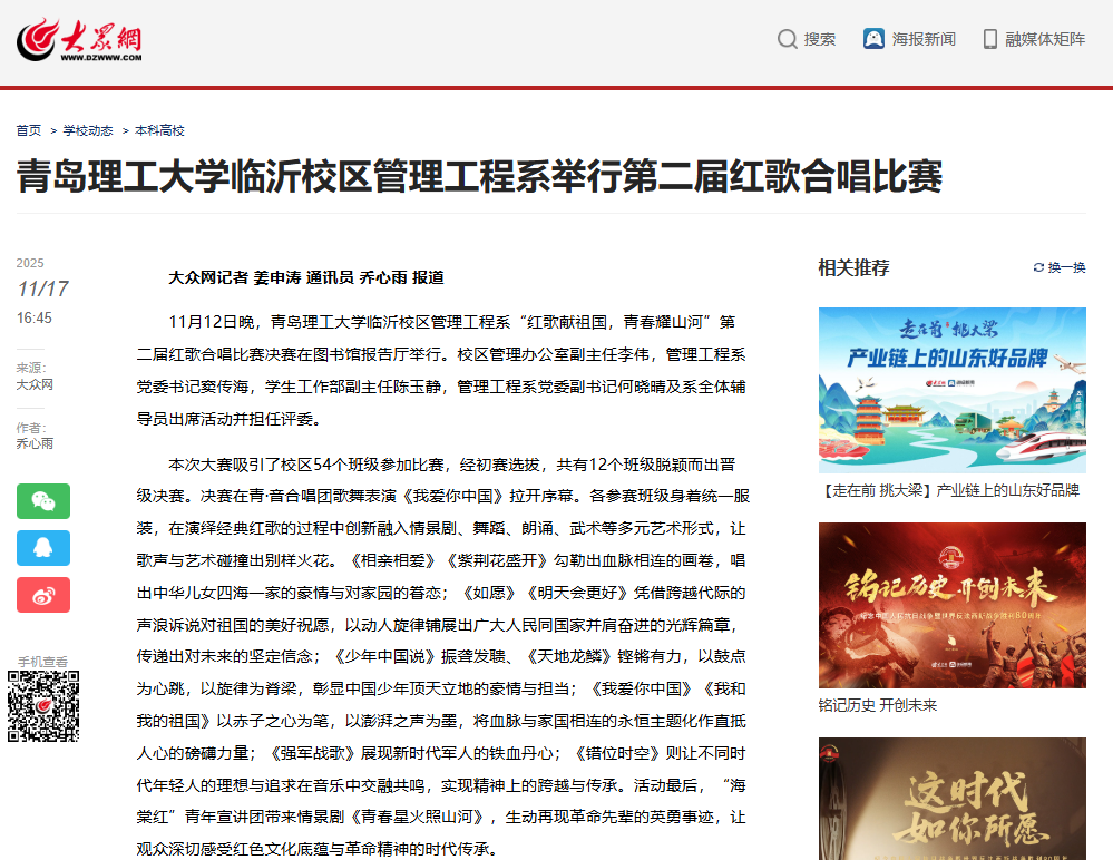 【大众网】青岛理工大学临沂校区管理工程系举行第二届红歌合唱比赛