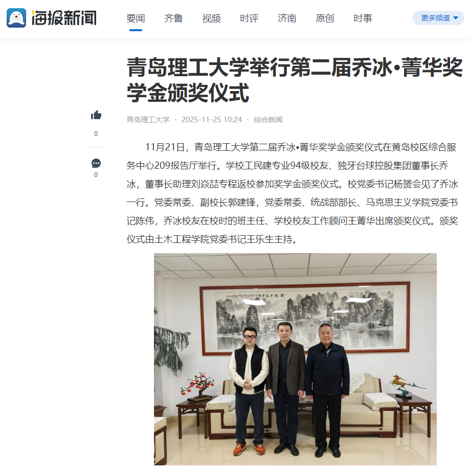 【中国网】青岛理工大学举行第二届乔冰•菁华奖学金颁奖仪式