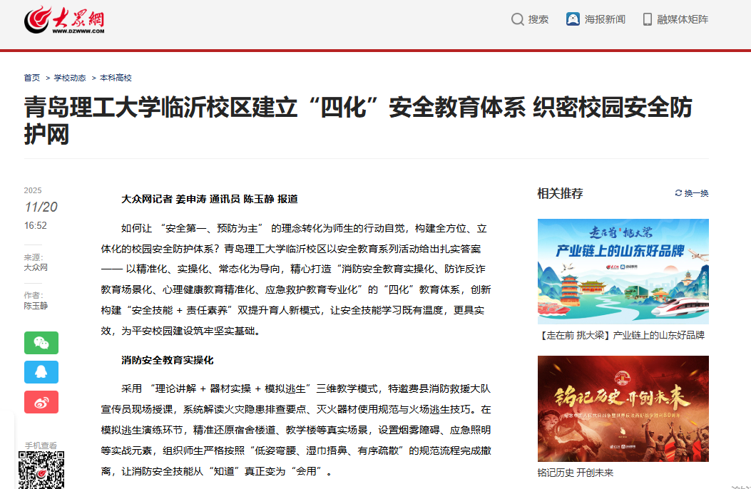 【大众网】青岛理工大学临沂校区建立“四化”安全教育体系 织密校园安全防护网