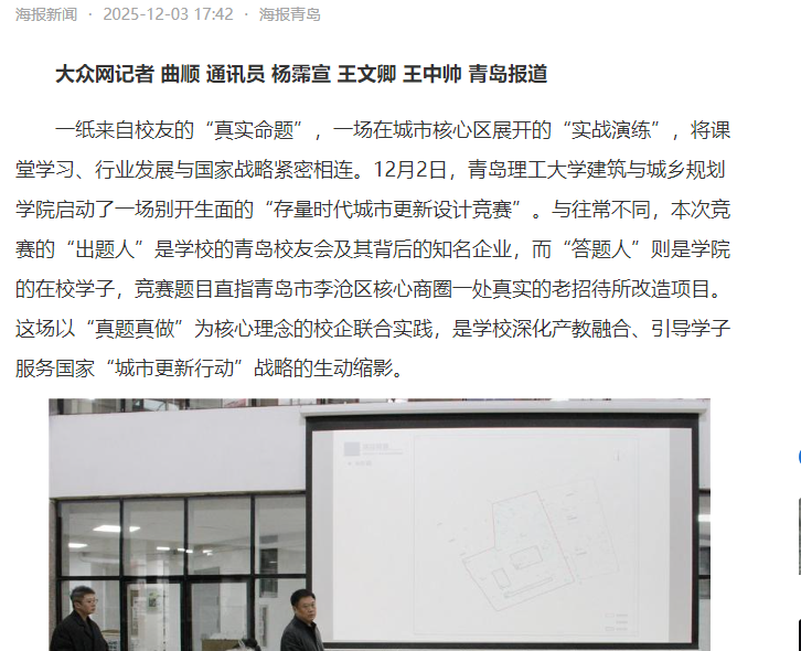 【海报新闻】青岛理工大学建筑与城乡规划学院:校友出题,学生“真题真做”,设计实践链接国家战略与青春智慧