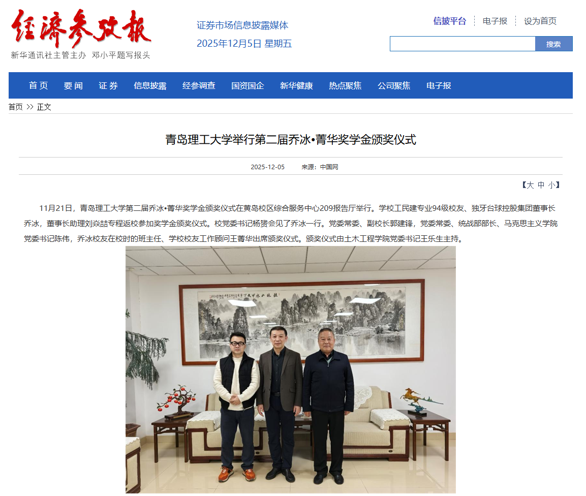 【经济参考报客户端】青岛理工大学举行第二届乔冰•菁华奖学金颁奖仪式