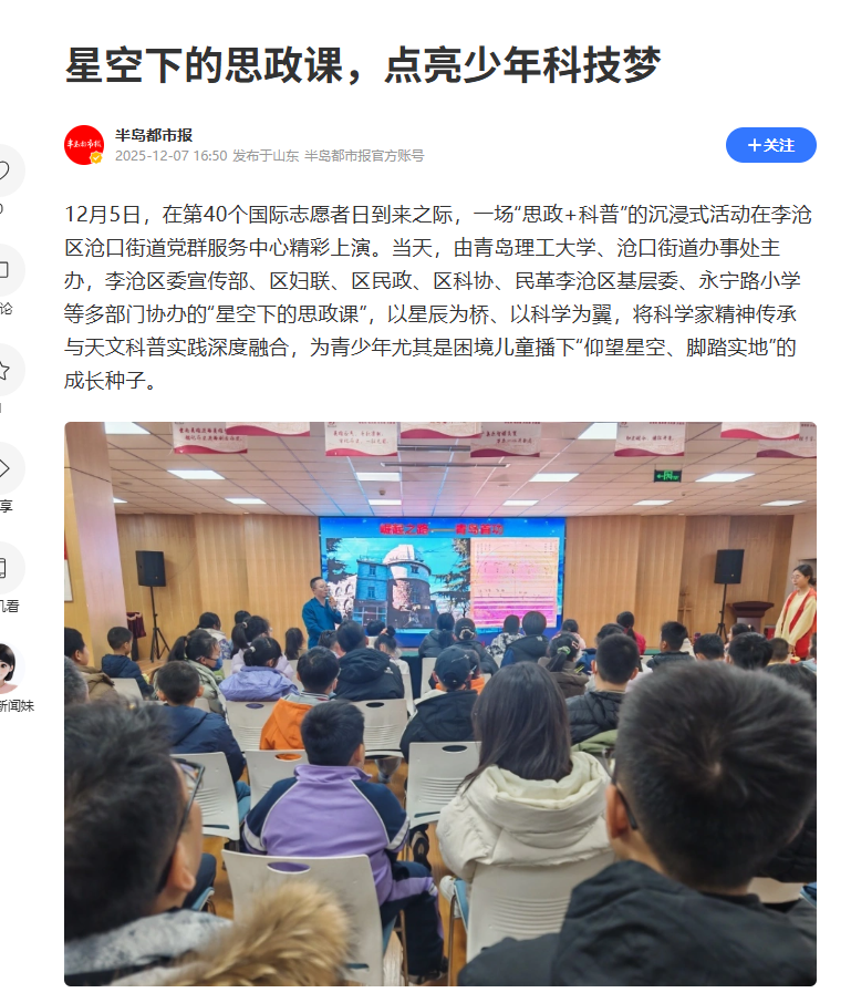 【半岛都市报】星空下的思政课,点亮少年科技梦