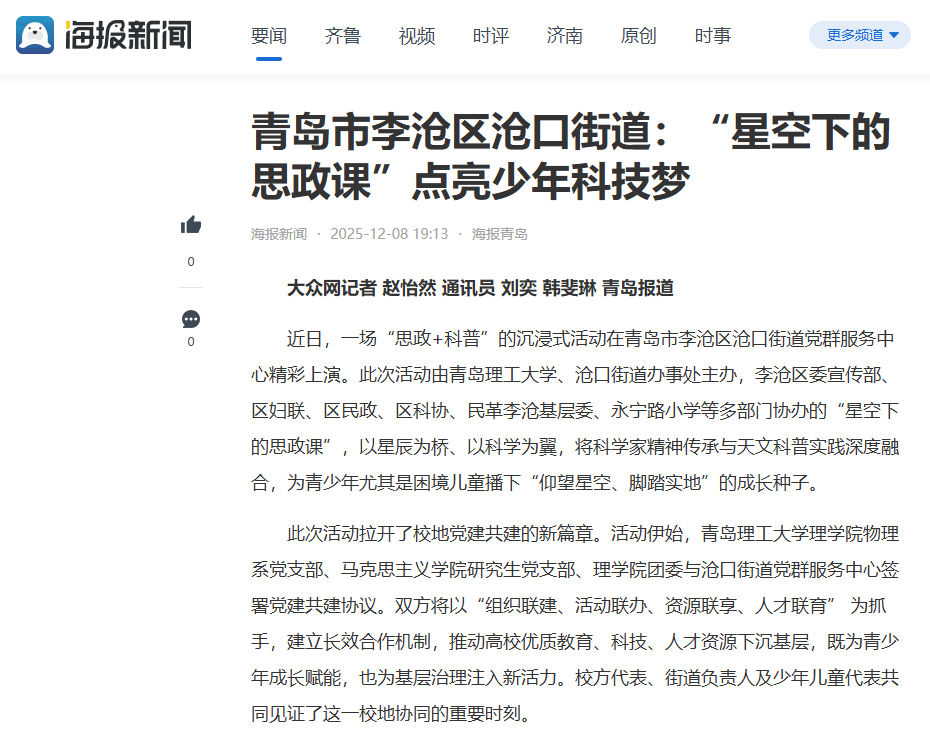 【海报新闻】青岛市李沧区沧口街道:“星空下的思政课”点亮少年科技梦