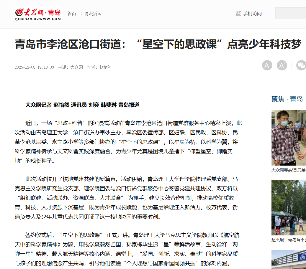 【大众网 青岛】青岛市李沧区沧口街道:“星空下的思政课”点亮少年科技梦