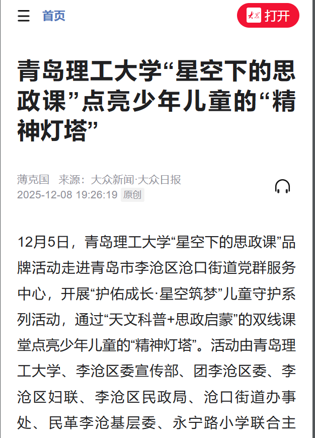 【大众新闻·大众日报】青岛理工大学“星空下的思政课”点亮少年儿童的“精神灯塔”