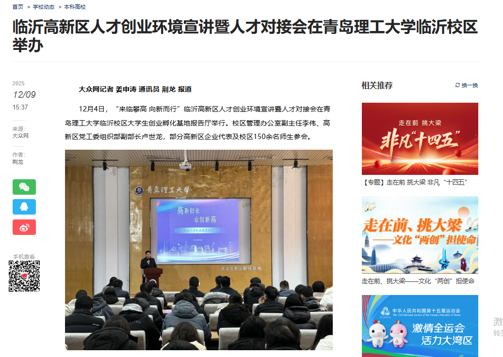 【大众网】临沂高新区人才创业环境宣讲暨人才对接会在青岛理工大学临沂校区举办