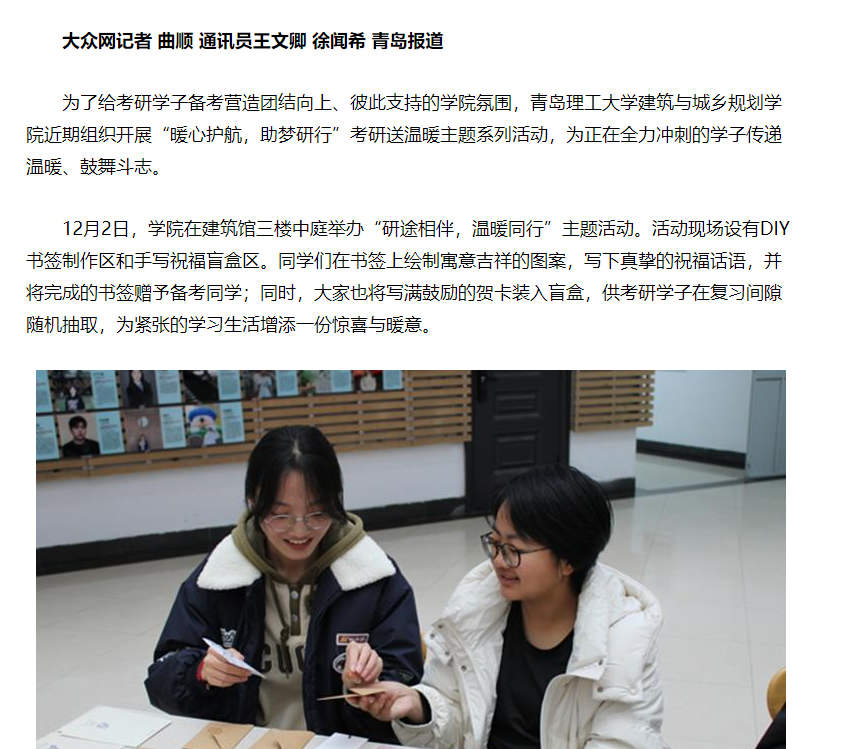【大众网·青岛】青岛理工大学建筑与城乡规划学院举办“暖心护航,助梦研行”考研送温暖主题系列活动