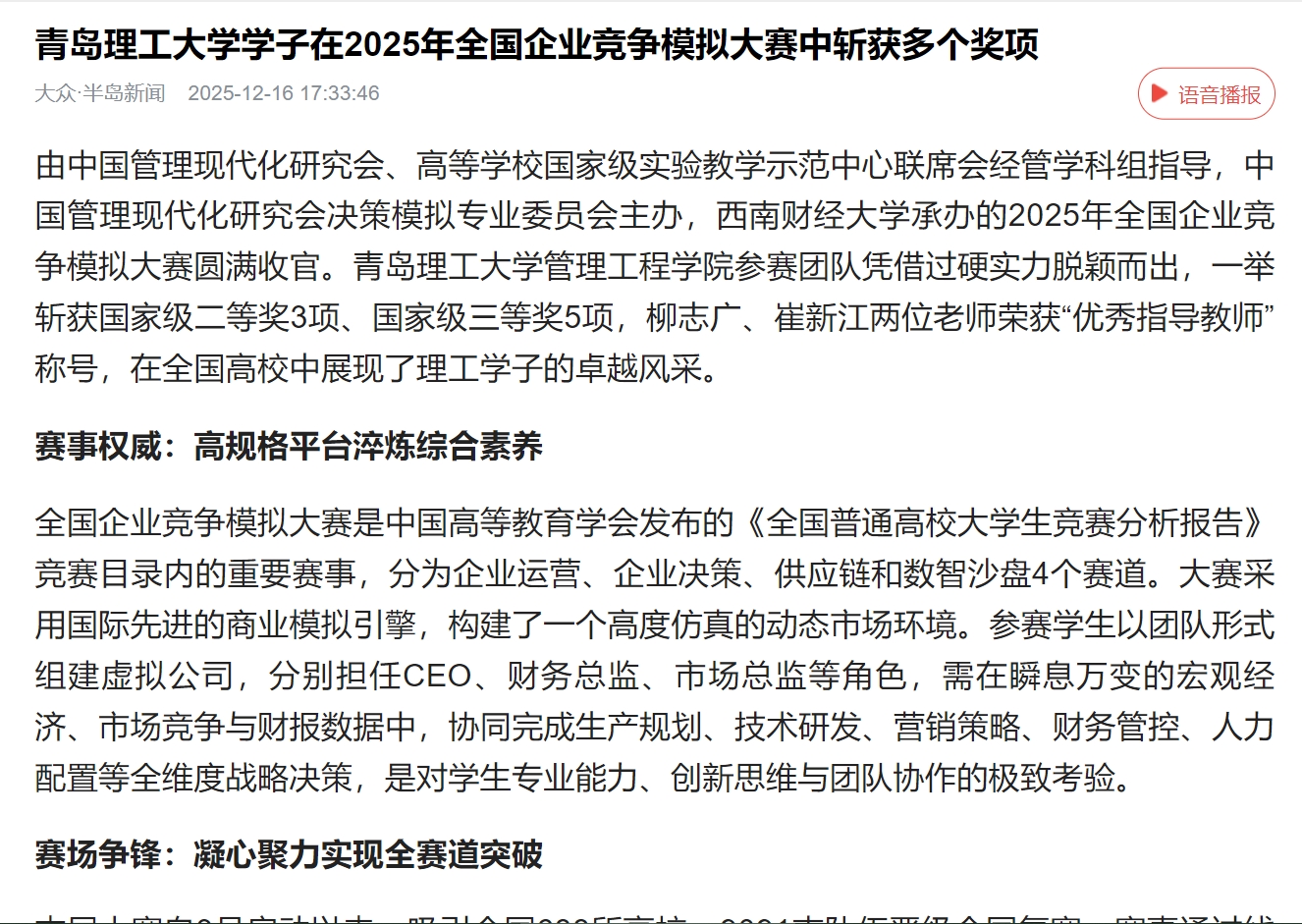 【大众·半岛新闻】青岛理工大学学子在2025年全国企业竞争模拟大赛中斩获多个奖项