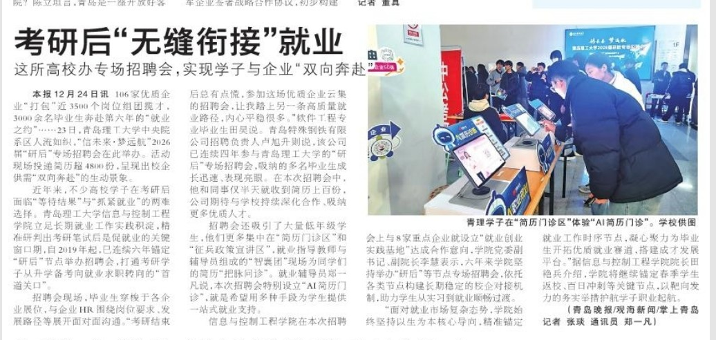 【青岛晚报】考研后“无缝衔接”就业 实现学子与企业“双向奔赴”