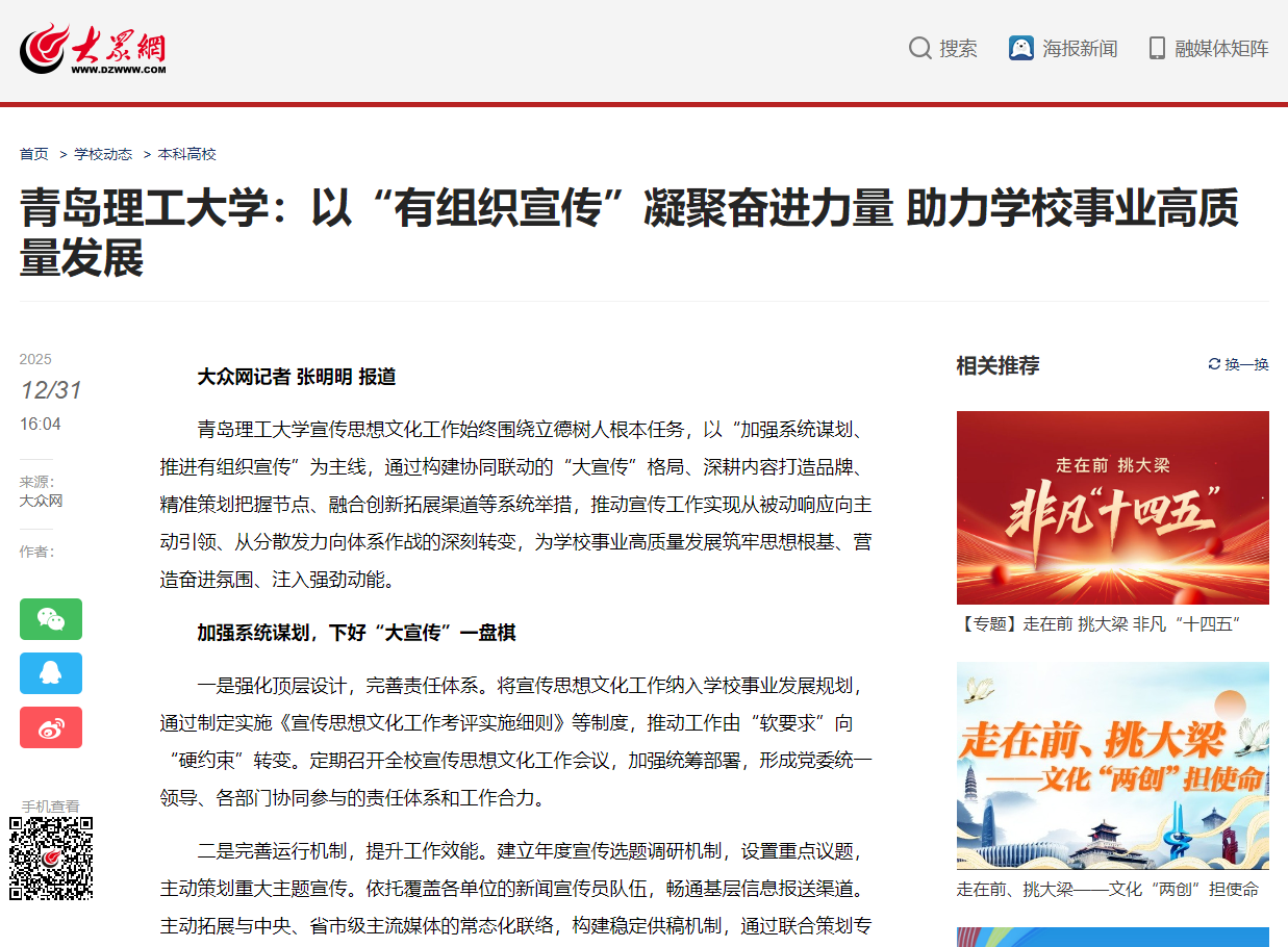 【大众网】青岛理工大学:以“有组织宣传”凝聚奋进力量 助力学校事业高质量发展