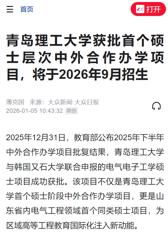 【大众新闻客户端】青岛理工大学获批首个硕士层次中外合作办学项目,将于2026年9月招生