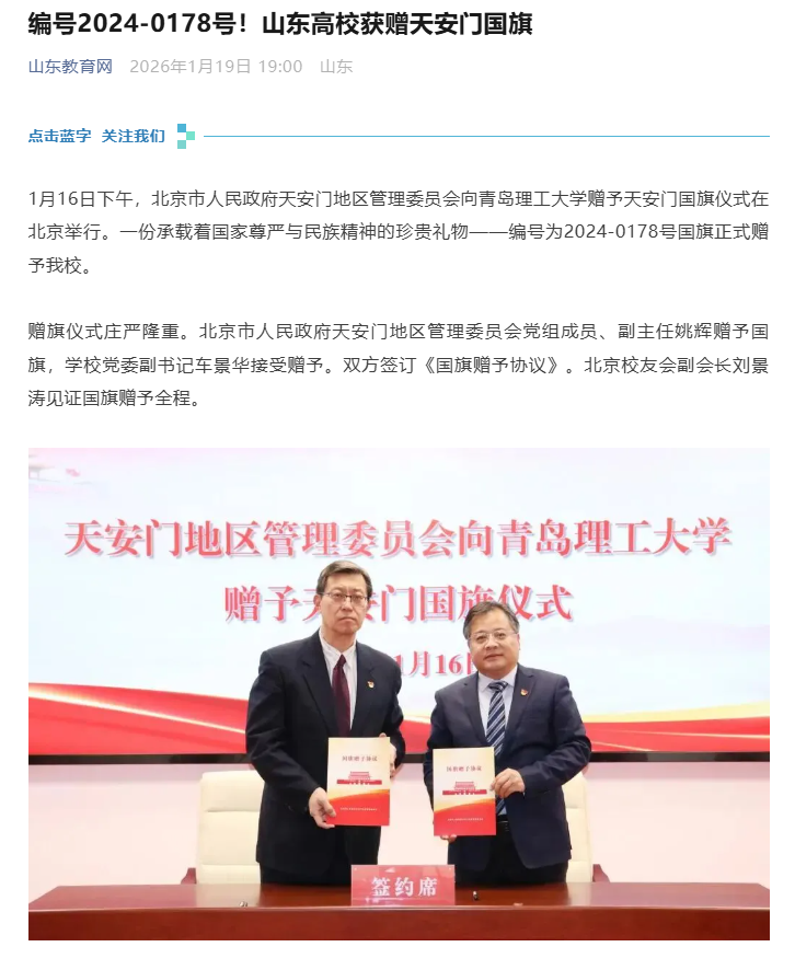 【山东教育网】编号2024-0178号!山东高校获赠天安门国旗