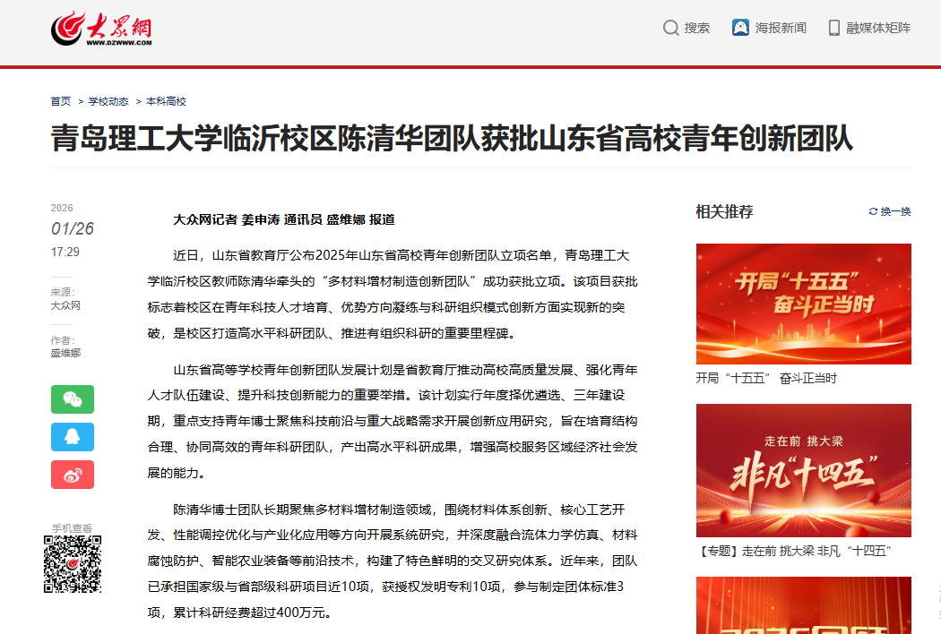 【大众网】青岛理工大学临沂校区陈清华团队获批山东省高校青年创新团队
