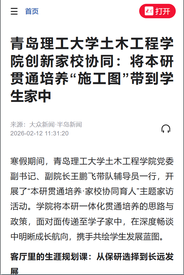 【大众新闻/半岛新闻】青岛理工大学土木工程学院创新家校协同:将本研贯通培养“施工图”带到学生家中
