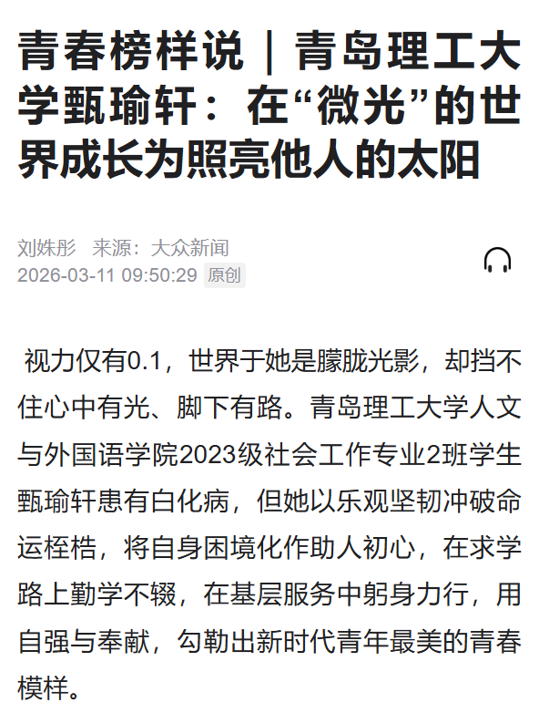 【大众新闻】青春榜样说|青岛理工大学甄瑜轩:在“微光”的世界成长为照亮他人的太阳