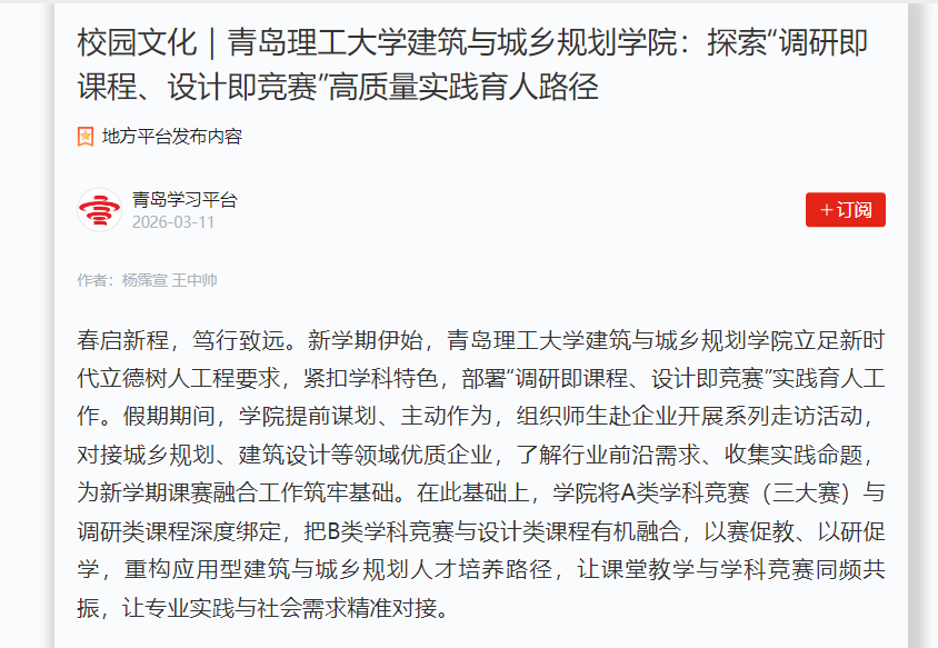 春启新程,笃行致远。新学期伊始,青岛理工大学建筑与城乡规划学院立足新时代立德树人工程要求,紧扣学科特色,部署“调研即课程、设计即竞赛”实践育人工作。假期期间,学院提前谋划、主动作为,组织师生赴企业开展系列走访活动,对接城乡规划、建筑设计等领域优质企业,了解行业前沿需求、收集实践命题,为新学期课赛融合工作筑牢基础。在此基础上,学院将A类学科竞赛(三大赛)与调研类课程深度绑定,把B类学科竞赛与设计类课程有机融合,以赛促教、以研促学,重构应用型建筑与城乡规划人才培养路径,让课堂教学与学科竞赛同频共振,让专业实践与社会需求精准对接。