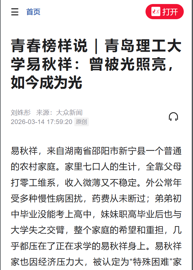 可生活的苦,从来不是击垮易秋祥的巨石。“从小我就明白,对于农村孩子来说,‘知识改变命运’不是一句口号,而是走出困境的唯一出路。”易秋祥说,2023年9月,当她收到青岛理工大学的录取通知书,成为信息与控制工程学院网络空间安全专业的一名学生时,她知道,自己终于踏上了追梦的征程。