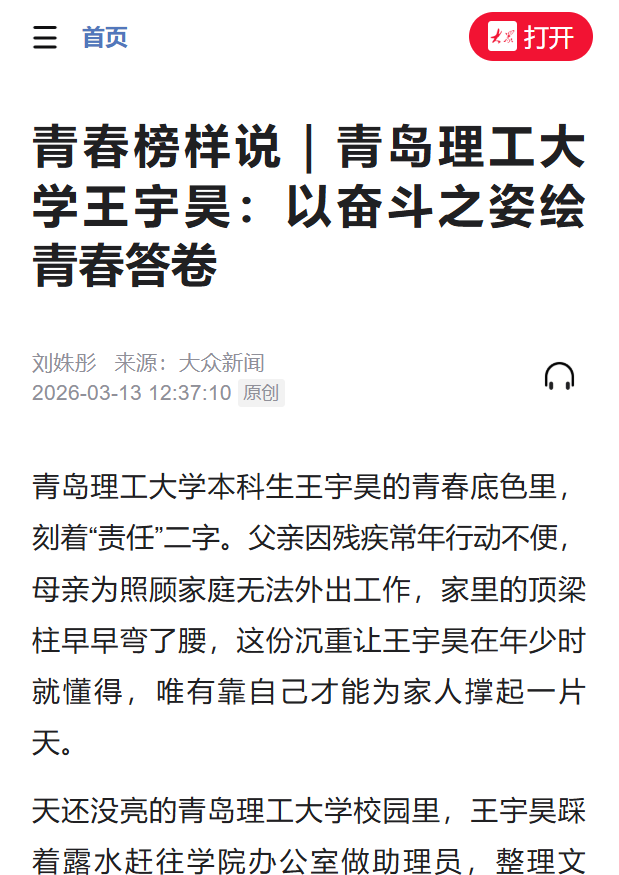 青岛理工大学本科生王宇昊的青春底色里,刻着“责任”二字。父亲因残疾常年行动不便,母亲为照顾家庭无法外出工作,家里的顶梁柱早早弯了腰,这份沉重让王宇昊在年少时就懂得,唯有靠自己才能为家人撑起一片天。
