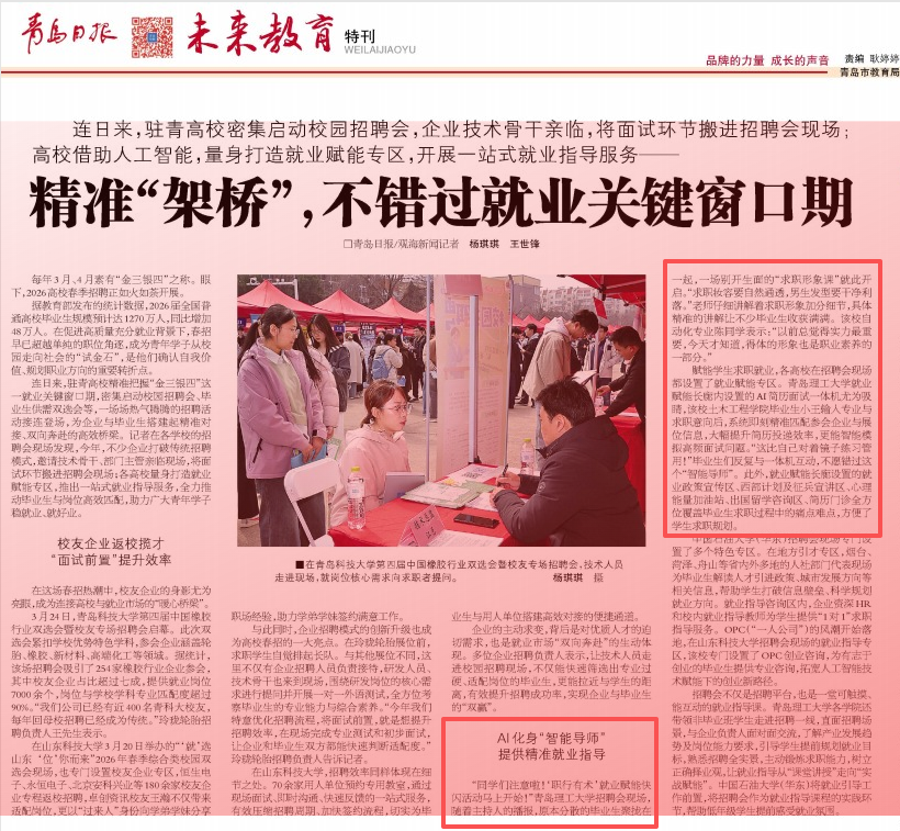 赋能学生求职就业,各高校在招聘会现场都设置了就业赋能专区。青岛理工大学就业赋能长廊内设置的AI简历面试一体机尤为吸睛,该校土木工程学院毕业生小王输入专业与求职意向后,系统即刻精准匹配参会企业及岗位信息,大幅提升简历投递效率,更能智能模拟高频面试问题。“这比自己对着镜子练习管用!”毕业生们反复与一体机互动,不愿错过这个“智能导师”。此外,就业赋能长廊设置的就业政策宣传区、西部计划及征兵宣讲区、心理能量加油站、出国留学咨询区、简历门诊全方位覆盖毕业生求职过程中的痛点难点,方便了学生求职规划。