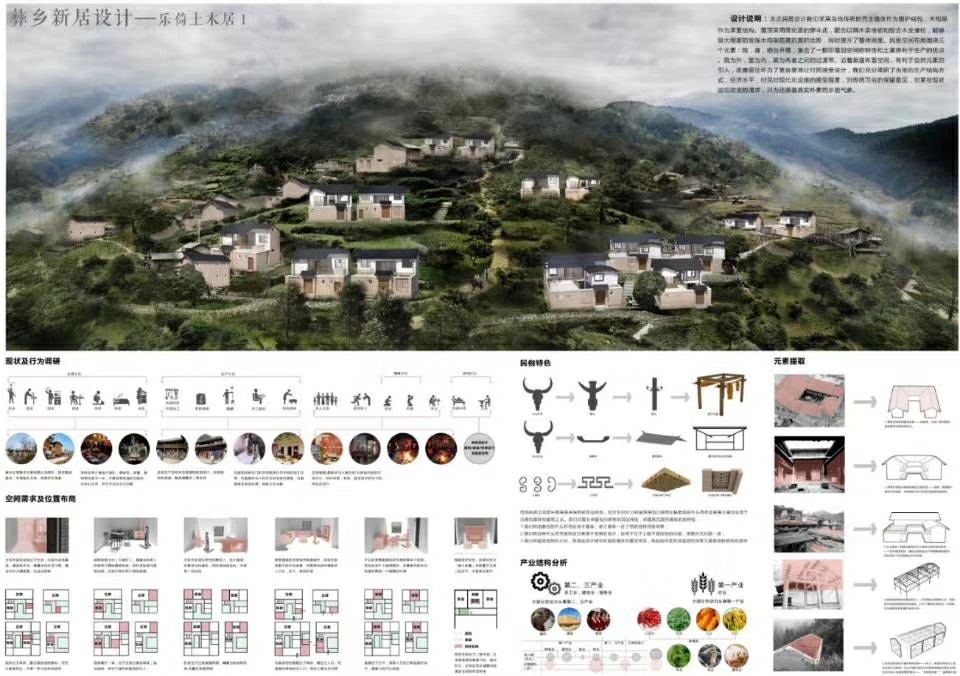 在这次比赛中,作品《彝乡新居设计——乐倚土木居》以恰如其名的方式结合土与木这两种地域性材料进行设计,采用传统的夯土墙体作为围护,在结构上力求合理地保留了传统的穿斗式屋顶并结合现代钢木梁楼板和胶合木支撑体系,以实现在结构上的传承创新;通过对传统民居一颗印和彝族生活方式的考察,设计作品中保留院、廊、晒台等传统生活空间,并以之为基本元素进行设计,尊重当代习俗,保留堂屋为重的空间布局和较为重要的祭祀空间,同时调研当地居民对现代化设施的接受程度,添加原本缺失的现代化卫厨设施;作品中所有的材料选择考虑到当地的生产方式结构及经济水平现状,一切以可建造性作为前提,是形体、功能与结构高度统一的设计。大赛组委会也对该设计的准确性给予了肯定,认为其结构体系明确,考虑到当代抗震要求并结合了当地传统民俗和生活习惯;这无疑展现了建筑与城乡规划学院学子不俗的专业实力。