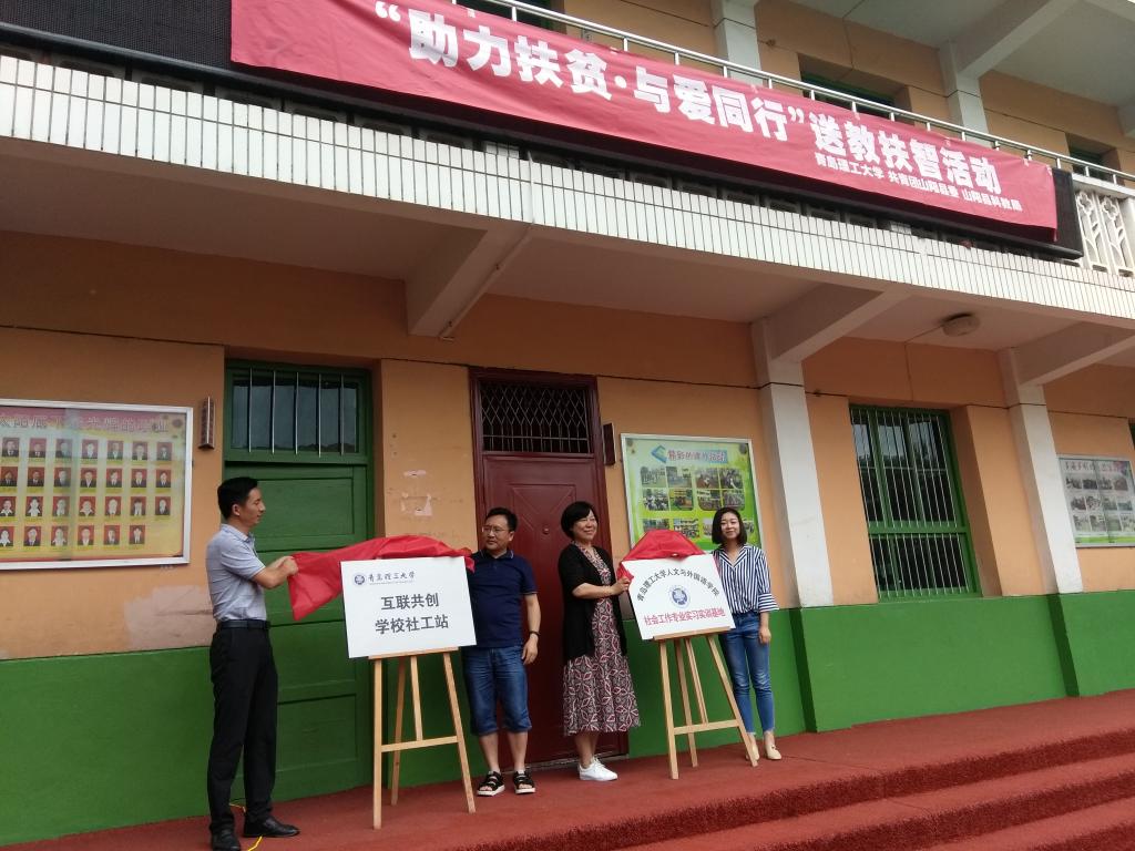 这次“送教扶智·助力扶贫”服务共进行了三个层面的工作。首先,学院社会工作专业团队在陕西省山阳县法官镇小学建立“互联共创”学校社工站和“社会工作专业实习实训基地”。于晶利、刘启辉老师,山阳团县委副书记刘珍惜、法官中心小学校长王录斌共同为“互联共创”学校社工站和社会工作专业实习实训基地揭牌。