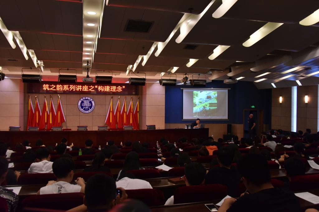 学术报告开始后,西蒙先生从本质与平凡两点介绍了讲座核心:构建理念。随后,他通过演示自己的案例,说明建筑设计是从理念出发,而理念包含人文、形态等很多内容。他通过英国皇室平面图、裸城、对巴黎城市的设计分析几个案例,阐述出建筑设计要体现当地地域元素、人文气息和历史,以此来使设计升华。西蒙以AHMM设计院设计的经典项目为案例,强调了建筑空间、自然环境与人之间的融合与交互,他认为建筑需要融入周边建筑环境与自然环境,相互之间相辅相成、互为景致;同时,他提倡增加建筑的共享空间,促进人与人之间面对面的交流沟通,以开放的建筑理念为建筑的使用者增加使用的乐趣。他还说明,建筑设计的过程中,可以通过使用周围环境形成一个和谐的整体,自然的植物往往是大自然赋予建筑的最好灵感。与此同时,在设计的过程中,要敢于发出质疑,有全局观。