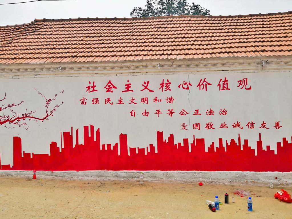 同时,志愿者们进行墙体喷绘,努力传播“绿水青山就是金山银山”的积极思想,对于中国的传统文化秉承一种继承传统、推陈出新的精神,努力弘扬我国传统文化,并通过海阳市盘石店镇当地的文化特色去进行艺术设计装饰,保留其文化底蕴,丰富其文化精神。