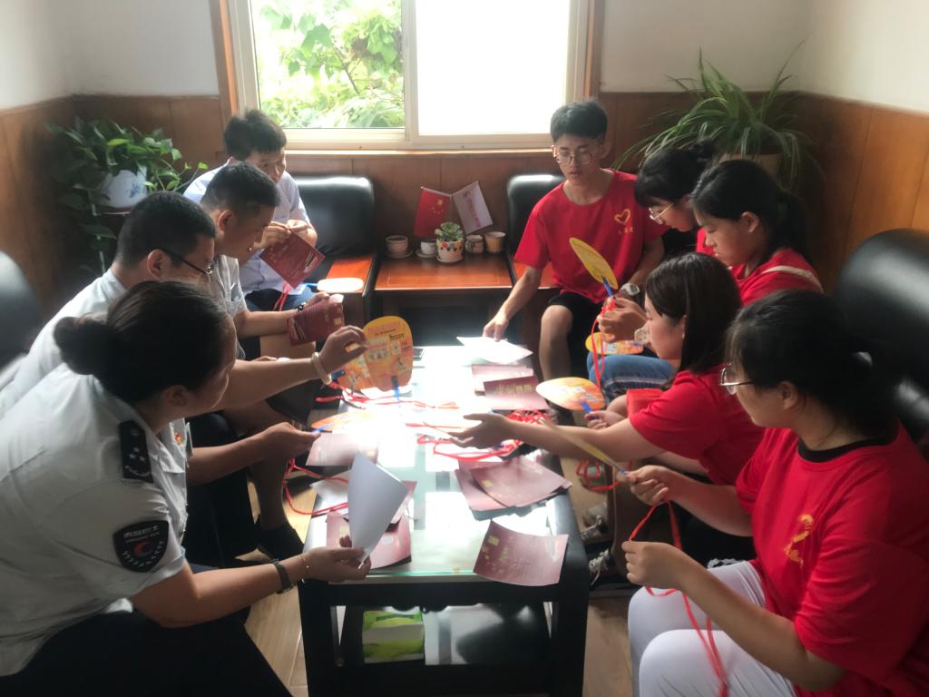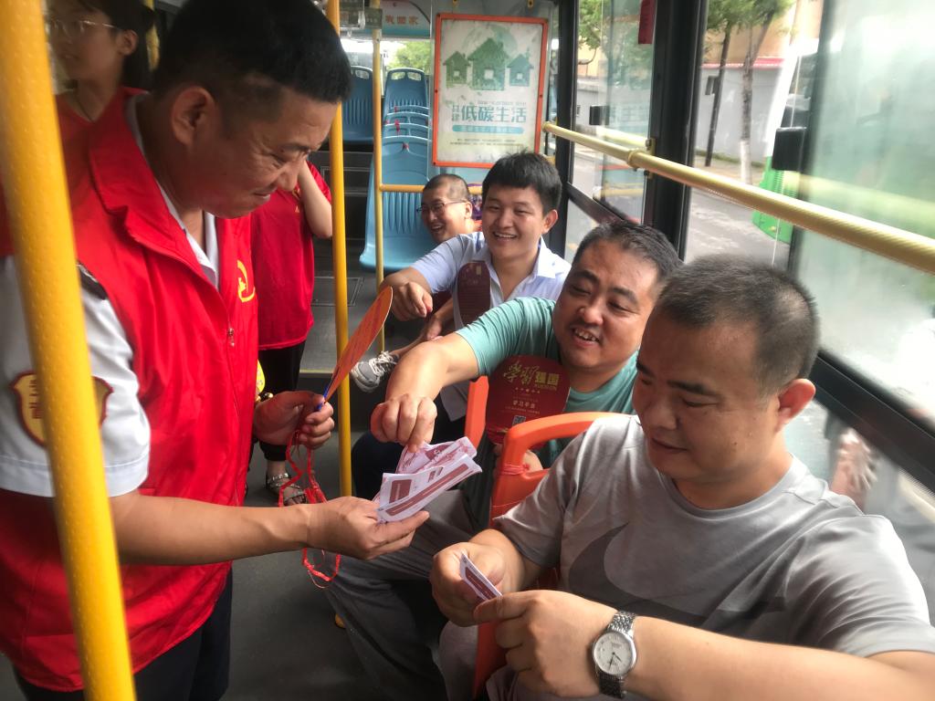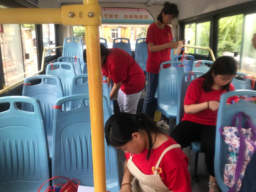 8月2日上午,学院志愿者相聚在市北巴士第四分公司,把精心制作的“学习强国”宣传爱心扇拴在公交车椅背上,供乘客在防暑降温的同时了解“学习强国”平台。