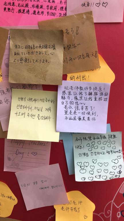 9月9日教师节前夜,我院全体同学在各班级心理委员的组织下,把对老师的感恩倾注于笔尖,小小的便签纸表达出对老师的拳拳祝福和感恩,外语专业的同学用本专业的语言知识回馈老师,书写内心感激之情。本次活动的便签纸将会在教学楼前的展板上张贴,节日虽过,师恩不忘。