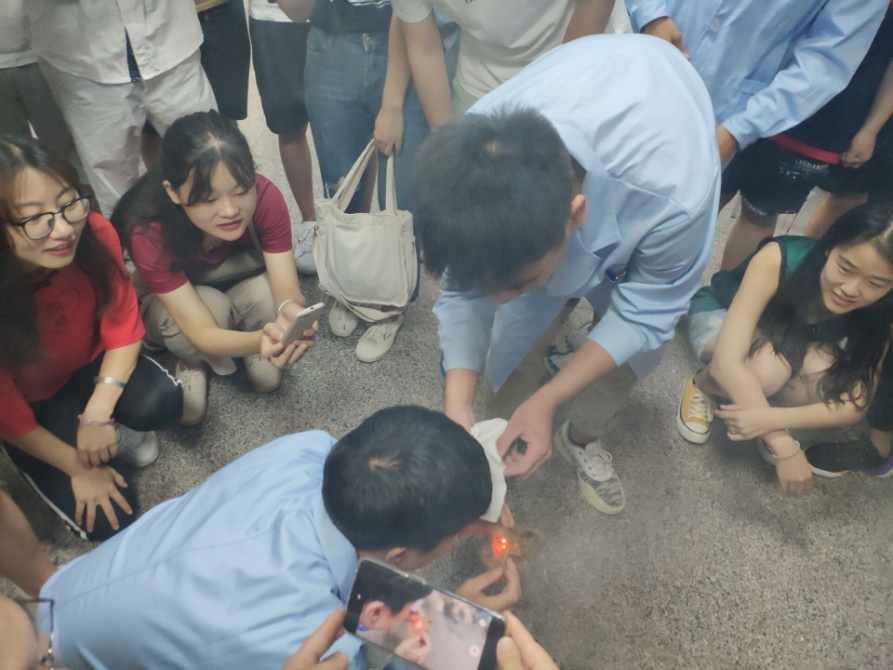 为了让同学们亲身感受摩擦是什么,实验室师生为同学们准备了三个趣味实验秀。在第一个趣味实验秀——神奇的“非牛顿流体”中,大家争先恐后地用锤子敲击玉米淀粉制作的液体,见识到了“非牛顿流体”的神奇之处。趣味项目——“食用油和工业油谁更粘球?”中,同学们踊跃地做起了释放实验摆球的小助手。最后一个实验秀“真人体验钻木取火”也是所有人最感兴趣的实验秀,当木杆与木板快速摩擦引燃火苗的一刹那,同学们兴奋地纷纷鼓掌。