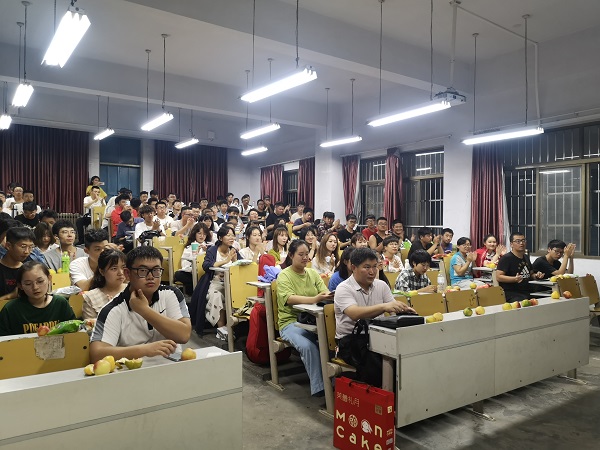 各班的晚会节目精彩纷呈,让人目不暇接。新生不仅感受到了欢乐,更是在开学之初,认识了那一张张可爱的,洋溢着青春与活力的面容。慷慨激扬的爱国演讲引起了同学们的情感共鸣,青春欢快的歌舞获得了阵阵掌声、诙谐幽默的脱口秀让晚会气氛不断高涨。晚上8时,学院党总支书记曲成平、副书记邵先锋,副院长张纪刚一行的到来,更是把晚会推上了高潮。曲成平一行走访了所有的班级,并向新生发放月饼,与大家一同观看晚会节目,曲成平代表学院对2019级新生来到土木工程学院学习表示热烈欢迎,满怀期望地对新生们说:“虽然大家在中秋之夜无法回家,但土木工程学院是同学们的另一个家,希望同学们尽快适应大学生活,在大学里完成对自己能力的培养、提升。要常怀感恩之心,感恩父母辛劳付出,把自己培养成一名大学生,在欢乐的中秋晚会之余多与父母联系,希望大家在土木工程学院的四年里,学有所成,成长为国家的栋梁之材”。