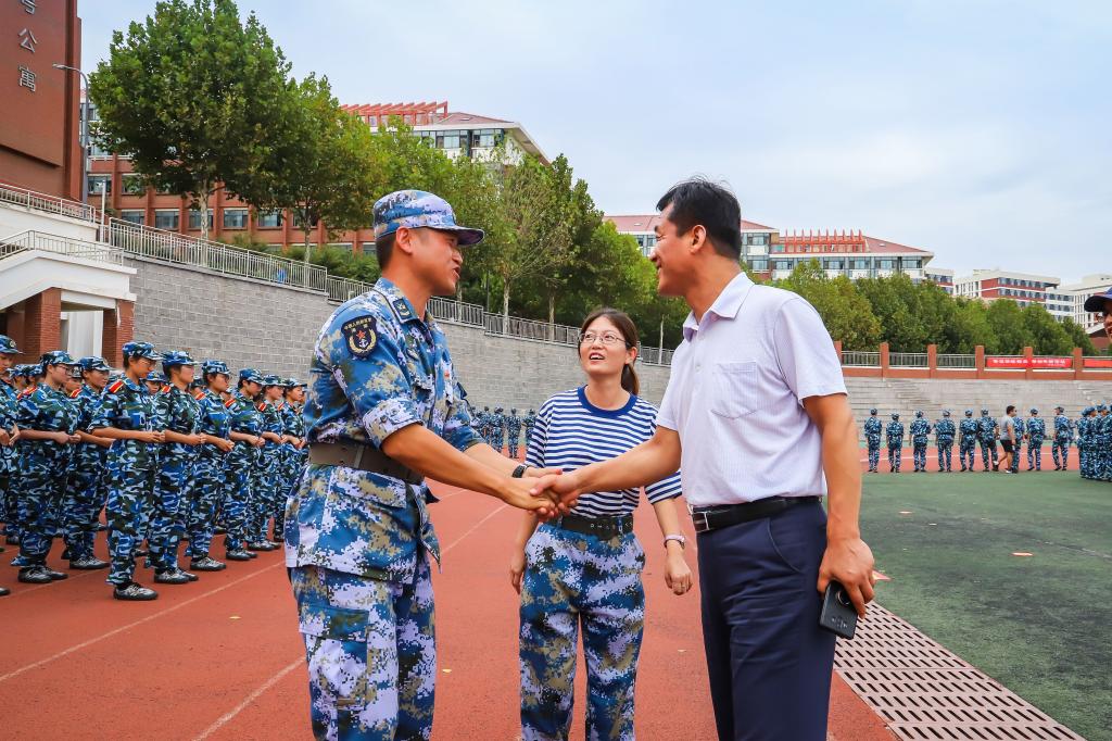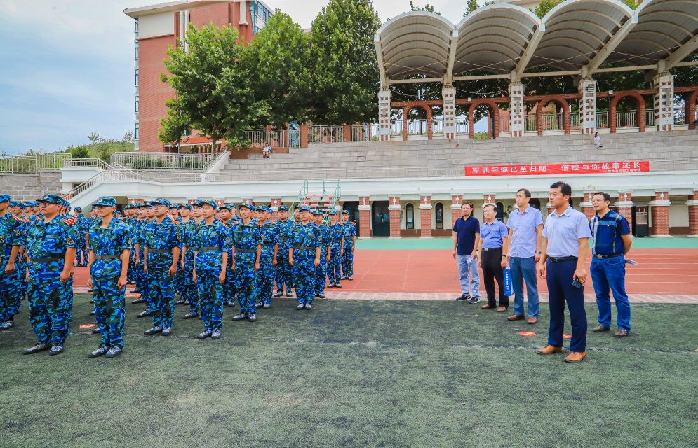 9月17日下午两点半,信息与控制工程学院党总支书记董典同、党总支副书记曲良波、副院长聂廷远、赵景波、宋传旺、分团委书记(学工办主任)张英华一行七人深入军训现场,视察学院2019级新生的军训工作,询问军训进展及训练情况,慰问教官和新生。