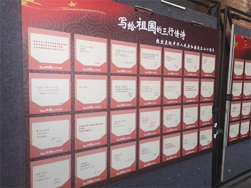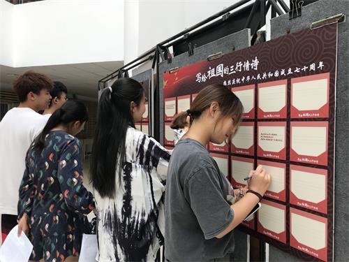 活动中,同学们拿起手中的笔,在卡片上写下每个人想对祖国说的“三行情诗”。用优美的文字表达出来,彰显着学生们对祖国的热爱。建筑学(中外合作办学)192班铭禾的“吾家何在?伊可见满天星斗缀在汤汤赤海,照亮满城黄金甲。”其字里行间流露出对祖国深深的爱意,文字铿锵有力,爱国情感绵绵不绝。而建筑学194班张孟琳的“用我一生伴你,一切皆可离,独独是你不可弃。”将这许许多多的情谊化作切切三行,饱含了满满的爱国情,每一句都带给我们真切的感动。学生们以文字的形式表达了对祖国的热爱,其他同学也都纷纷前来观看。