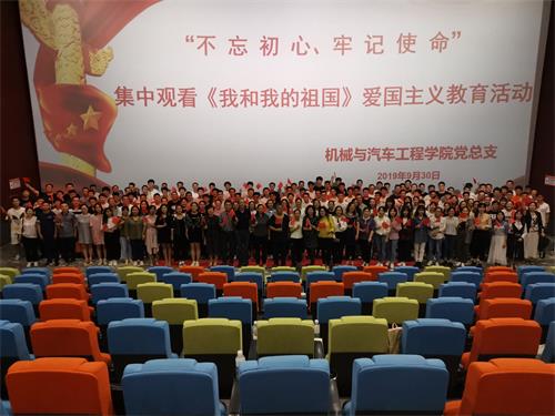 为庆祝中华人民共和国成立70周年,切实增强党员的使命感,激发爱党爱国热情,结合“不忘初心、牢记使命”主题教育活动,9月30日下午,机械与汽车工程学院党总支组织学院师生党员、党员发展对象、入党积极分子等200余人在电影院集中观看爱国主义教育影片《我和我的祖国》。学院党总支书记岳丽宏、副院长王优强、各党支部书记参加活动,岳丽宏主持活动并致开幕词。