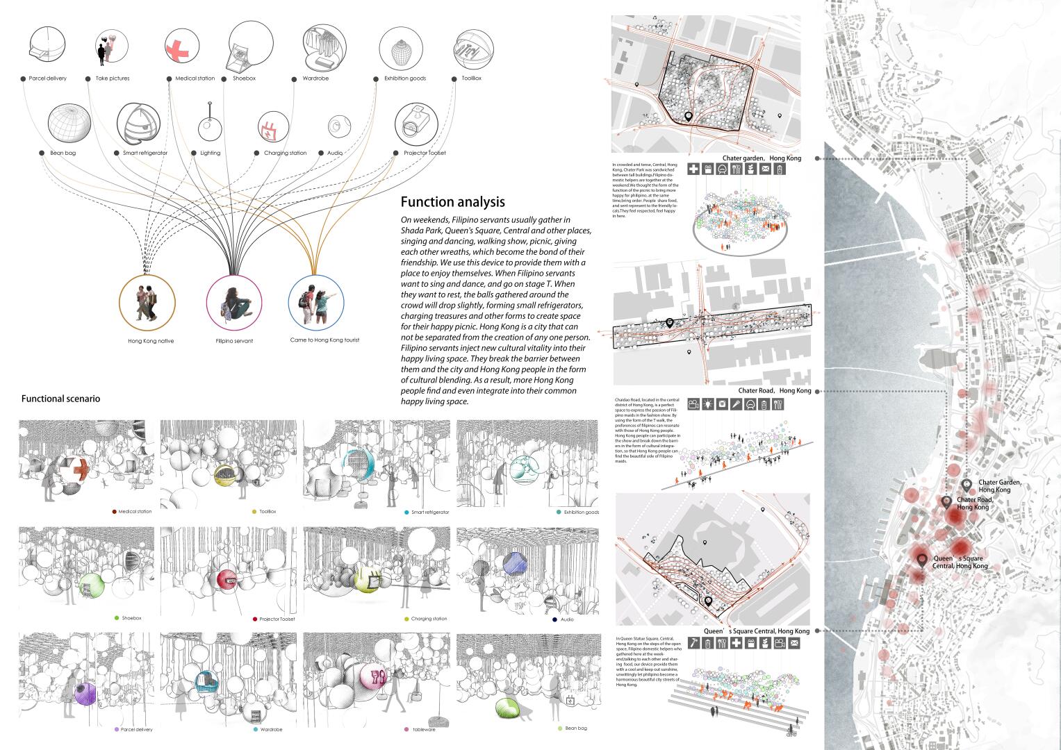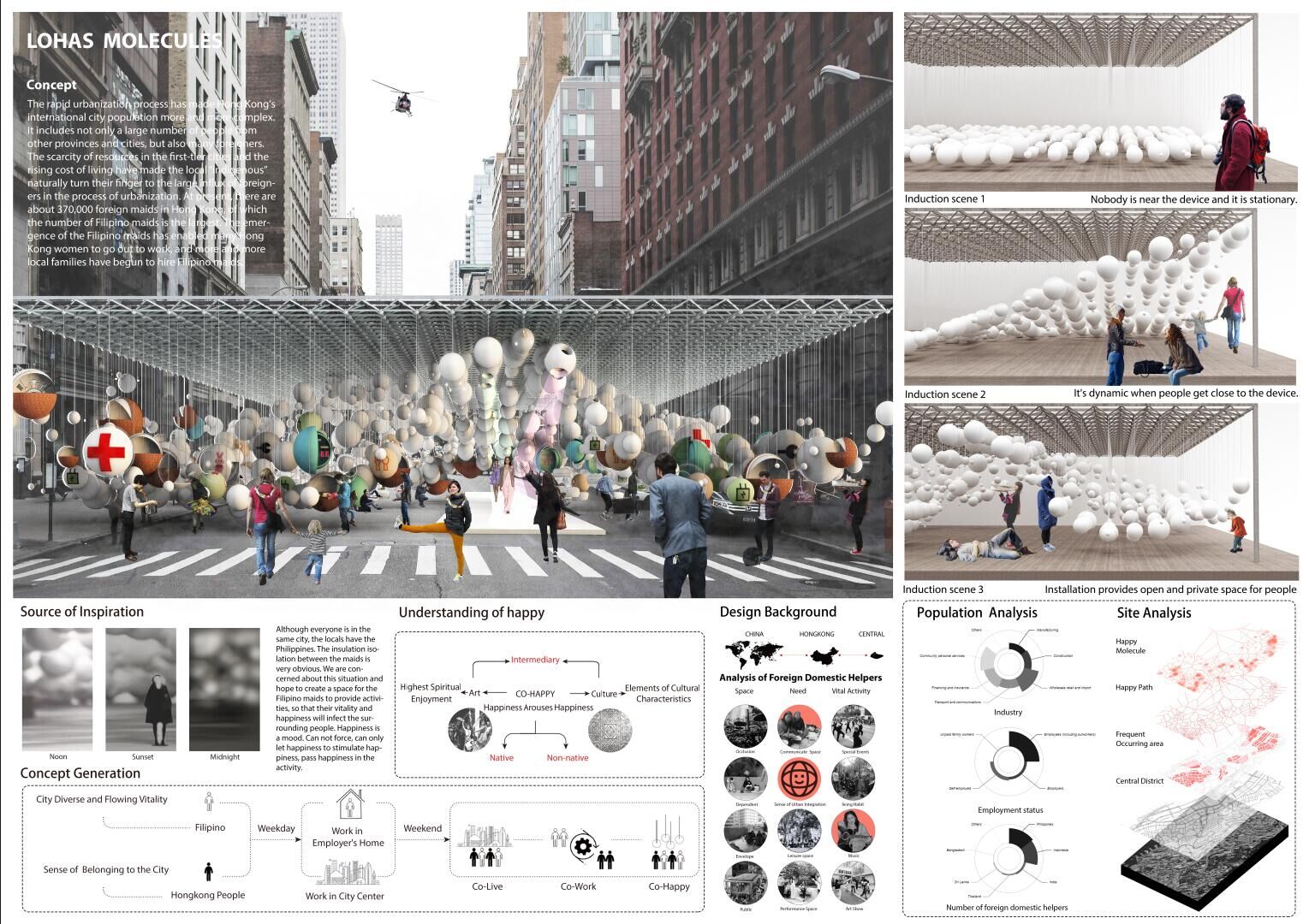 获奖作品《乐活分子》将目光聚集在香港。高速的城市化进程,不可避免地遭遇保守的本土主义者的不满,近年来经常听到诸如“外地人抢走了我们的生活空间”、“我们儿时的地方去哪儿”的论调。香港也不例外,一个生活节奏如此之快的城市,吸引着世界各地的人们来此就业,占有相当一定比例的菲律宾女佣正是其中一份子,每逢周末他们聚集于中环,遮打道等地,席地而坐,与人来人往的氛围产生了割裂,城市的整体性就此瓦解,他们的生活似乎是快乐的,但却深深地影响着城市的环境,仿佛与这个城市格格不入,成为了城市环境的缺口,作品希望能营造一种空间,为菲佣提供活动的场所,让他们的活力和快乐去感染周边的人,融入香港的城市环境,快乐是一种心情,无法强求,只能让快乐去激发快乐,在活动中传递快乐。