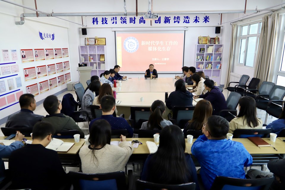 为进一步推动辅导员职业化、专业化建设,提升辅导员在新时代背景下运用新媒体提高思想政治教育工作成效的能力,10月31日上午,信息与控制工程学院特邀我校马克思主义学院党总支书记王菁华教授作“新时代学生工作媒体化生存”专题报告,信息与控制工程学院、机械与汽车工程学院和高等职业学院全体辅导员参加了活动。