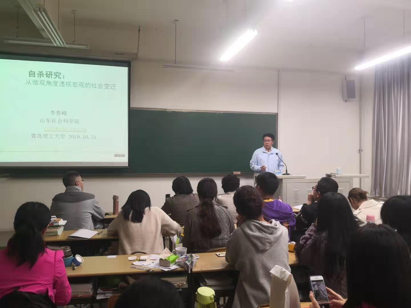10月31日下午,山东省社会学会会长、山东社会科学院李善峰研究员应青岛理工大学社会科学界联合会和人文与外国语学院邀请,在B222教室为我校师生做了题为《生命的意义:从微观角度透视宏观的社会变迁》专题学术讲座。讲座由副院长郭印主持。