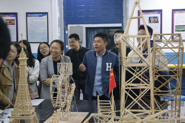 崔维久首先带领同学们参观了BIM协同创新中心,向同学们介绍了BIM的概念,表示BIM是建筑学、工程学及土木工程的新工具。它可以帮助实现建筑信息的集成,各种信息始终整合于一个三维模型信息数据库中,设计团队、施工单位、设施运营部门和业主等各方人员可以基于BIM进行协同工作,有效提高工作效率、节省资源、降低成本、以实现可持续发展。同学们也纷纷提出问题,崔维久以生动形象的比喻一一解答。王中帅带领大家参观了土木工程学院科技创新活动室,介绍学院在近几年科技创新竞赛的获奖情况,展示了科技创新协会结构设计部制作的结构作品。科创类活动是学院的学生工作特色,具有专业学科针对性强的特点。“纸牌造桥”结构设计大赛获奖作品能承重90千克,部分来访同学尝试站在上面并取得了成功,活动室现场气氛活跃。随后,同学们来到滨海人居环境学术创新中心参观。