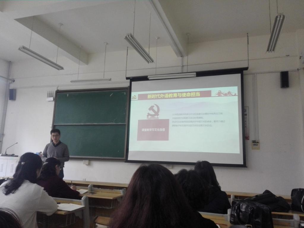 11月13日下午,人文与外国语学院党总支宣传委员、副院长郭印以《外语教育如何践行文化自信》为题在嘉陵江校区B126为人文与外国语学院部分师生党员上了一堂“不忘初心、牢记使命”主题教育专题党课。人文与外国语学院党总支书记王新到场指导。