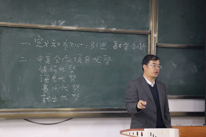 讲座伊始,刘春堂围绕中外合作办学的实质与优势等方面进行了讲解,阐述了中美合作办学宗旨、服务项目及目前与美国堪萨斯大学建立的联系。通过阐述堪萨斯大学优秀的师资力量,结合分析未来就业优势,为同学们解读了中外合作办学这几个字的含义,为大家明确了出国留学的动机,特别强调参与合作办学需要加强自身素养,鼓励同学们明确目标,不忘初心,努力学习。刘春堂还向同学们描述了出国留学的优势及就业前景,让同学们更加了解当前的出国留学的意义,并就如何出国,如何准备各阶段考试,如何安排学习时间提供了很多有益的建议。最后,同学们针对有关出国留学时间的长短、国家对中外合作办学政策等方面问题进行提问,刘春堂耐心地逐一回答。