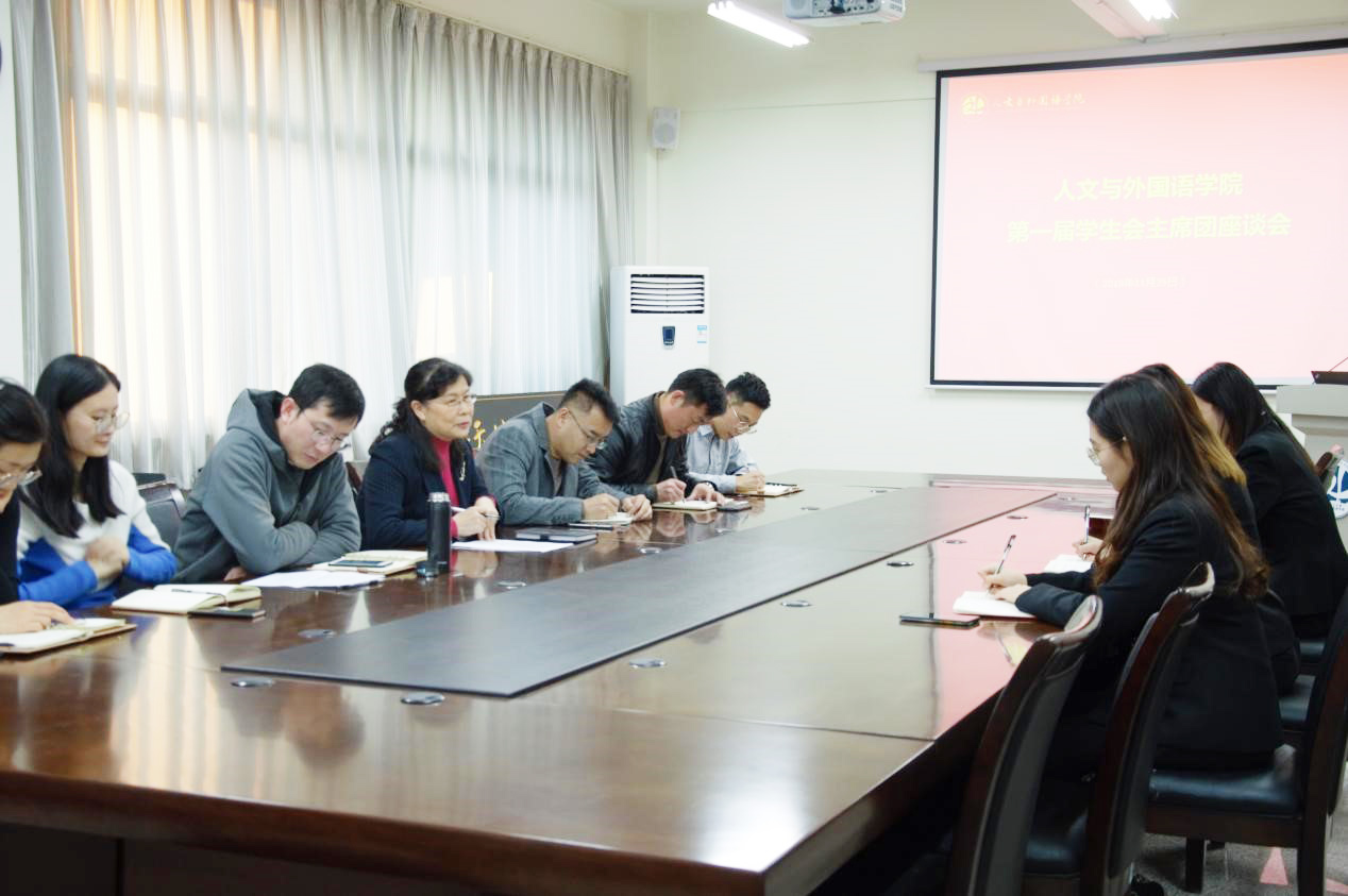 11月25日下午,人文与外国语学院党总支与第一届学生会主席团成员在嘉陵江路校区主教学楼A410会议室集体谈话。党总支书记王新,党总支副书记王振,分团委书记、学工办主任马松,辅导员陈刚、辛雪梅、贾舒文、王才升与新当选的学生会主席团成员见面,党总支书记王新与主席团成员进行了集体谈话,座谈会由党总支副书记王振主持。