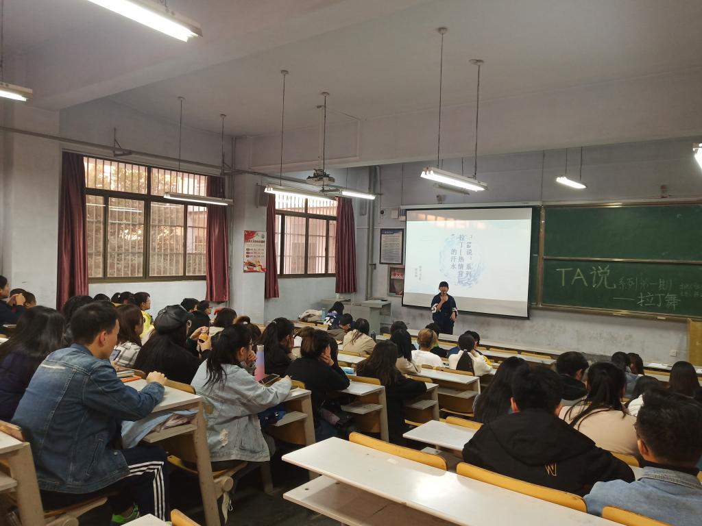 主讲人张东婉、主导人陈明玮共同举办了拉丁舞主题的“TA说”。活动中张东婉为大家讲解了拉丁舞各个舞种的相关知识,恰恰的热情、伦巴的柔美、牛仔的喜悦、桑巴的奔放、斗牛的高雅等,向在场的观摩团传达了舞蹈的魅力。同时她还向大家分享了六年拉丁舞学习的历程与感。她提到这六年中,自己从民族舞到拉丁舞的学习转变,培养了她坚持不懈、吃苦耐劳的精神品质,使自己不断成长,在各类舞蹈大赛中斩获佳绩。